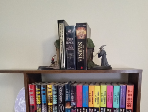 Vicki: From where I sit in my living room I can see the Hobbit bookends (see picture). There’s a pencil box that looks like books on a shelf. There’s a small framed cross stitch my aunt made for me w a reading quote. There’s a knick knack metal cat reading a book right next to a Christmas ornament of stacked books.